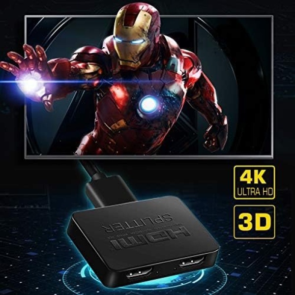 PORTABLE – 4K HDMI Splitter 1 in 2 out, size: 2.5×2.1×0.5 inches/ 6.3X5.3X1.2 cm ( L X W X H ), easy to use and carry, travel friendly. USB cable included(it needs to be powered via usb), no need external driver, safety and Eco-friendly (Seller recommend 25ft long hdmi cable(max))