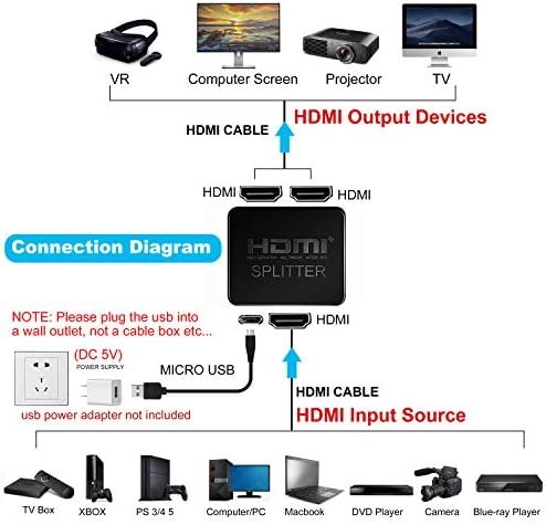 PACKAGE INCLUDED – 1 * [ 1 in 2 out HDMI Splitter], 1 * [USB cable(usb power adapter not included,Please plug the usb into a wall outlet,not a cable box etc…)],1*High Speed HDMI Cable