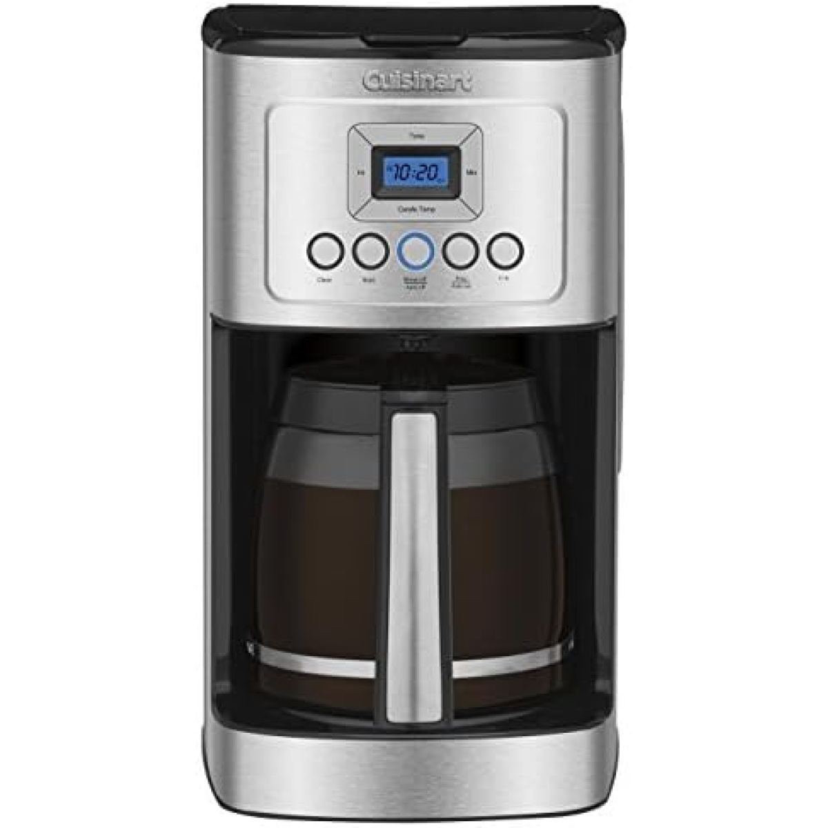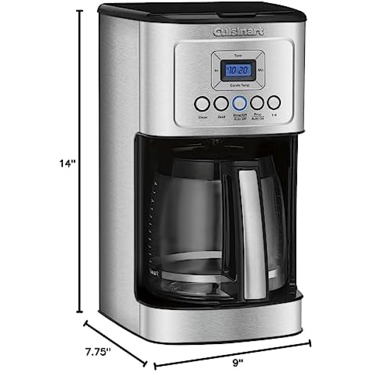 Turn up the flavor and the temperature on your coffee with the Cuisinart 14 Cup Programmable Coffeemaker! Using our cutting edge coffee technology, the 14 Cup Programmable Coffeemaker can give you hotter coffee without sacrificing taste. Choose a regular or bold flavor profile and set the brew-time up to 24 hours ahead so your next cup is ready when you are. The backlit LCD is easy-to-read, a ready tone can be turned on or off, and an indicator light signals when it’s time to decalcify. Refer to the user manual for troubleshooting steps. Features: Hotter Coffee with expert coffee-making technology to ensure hotter coffee temperature without sacrificing flavor or quality|Brew Strength Control allows you to select Regular or Bold coffee flavor|Fully Automatic with 24 hour programmability self clean 1–4 cup setting auto-off (0–4 hours) and optional ready alert tone|14 Cup Glass Carafe with decorative stainless steel handle|Easy-to-View Water Window for accurate filling Brew Pause™ feature lets you enjoy a cup of coffee before the brewing cycle has finished 60-Second Reset recalls settings and position in the brewing process in case of loss of power|Gold-Tone Coffee Filter and Charcoal Water Filter|Limited 3-Year Warranty.