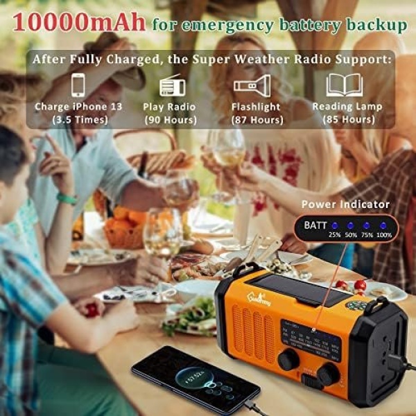 ⛺【4 Ways to Power with Battery Indicator】The outdoor gadgets have 4 power options in case of power outages. Built-in 10000mAh rechargeable battery and 4 power indicators show the remaining battery, this portable AM FM radio will be effortlessly recharged via manual winding up handle/solar panel/type c charging cable(included). No matter what emergency situation you encounter, this solar crank radio can always provide endless power!