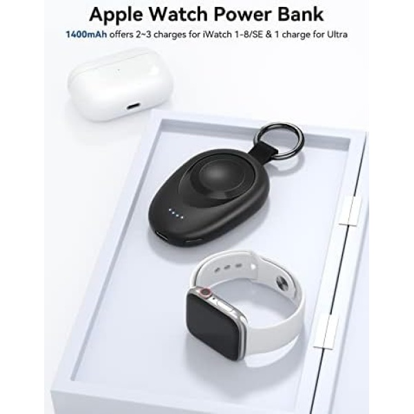 【Portable Charger for Apple Watch】This magnetic wireless charger for Apple Watch equipped with a powerful 1400mAh battery that can provide up to 2-3 full charges for iWatch 1-9/SE and one charge for Ultra/Ultra 2. This portable charger for Apple Watch also features four LED indicators that make it easy to check the battery level at a glance (0–25%–50%–75%–100%).
