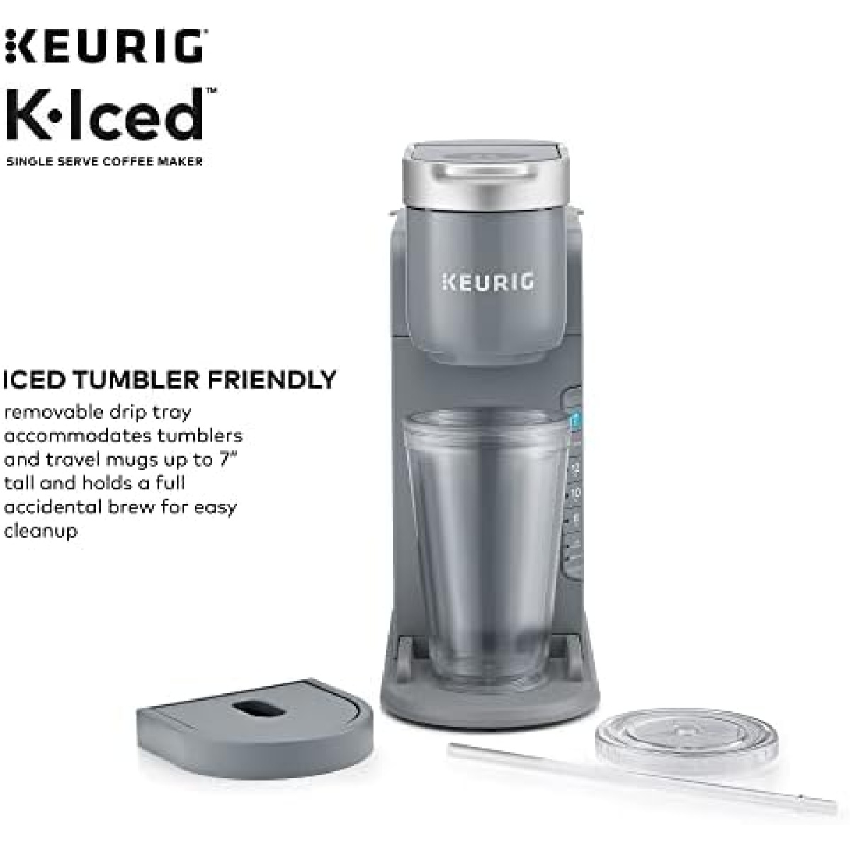 ICED TUMBLER FRIENDLY: Removable drip tray accommodates tumblers and travel mugs up to 7” tall and holds a full accidental brew for easy cleanup.