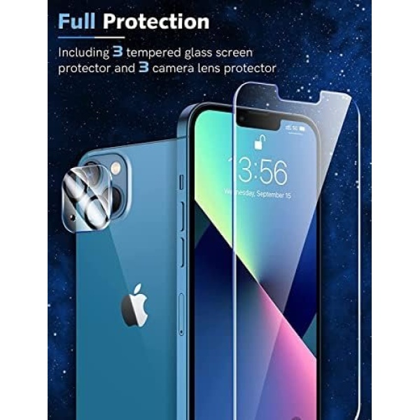 [iPhone 13 Camera Protector] Special designed full coverage camera lens protector for iphone 13 .Full coverage of camera lens area, protects camera lens from water, dust, fingerprints and scratches. Not affect the flash and also make light transmittance up to 99.99%, Providing long-lasting clarify and keep the bright, colorful image quality.Strong adsorption force, not easy to fall off, stable adhesion and no bubbles.