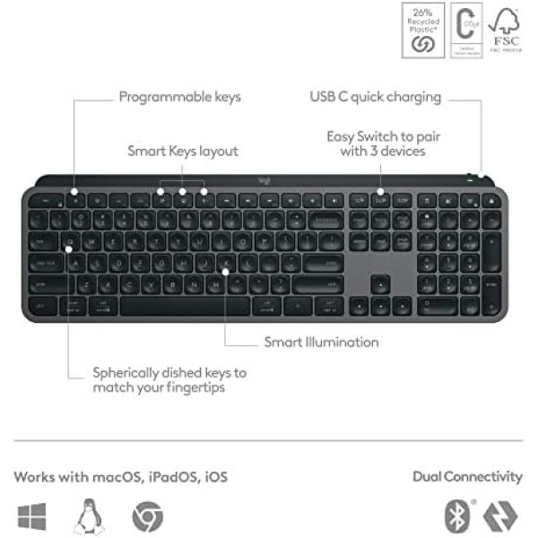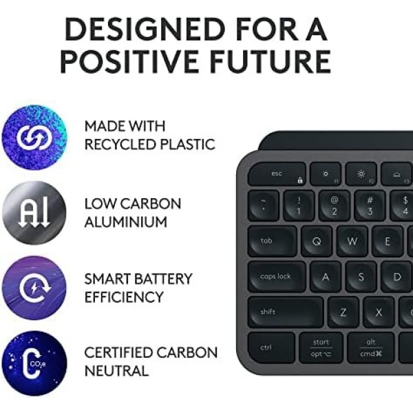 Recycled: Plastic parts in MX Keys S Wireless Keyboard include certified post-consumer recycled plastic — 26% for Graphite and 11% for Pale Grey (5)