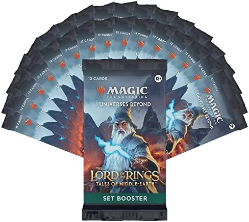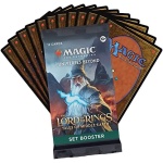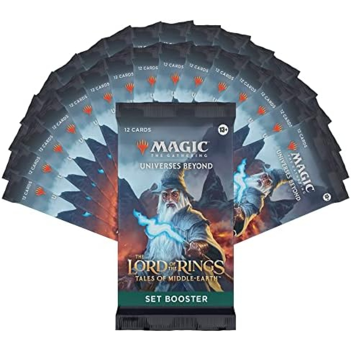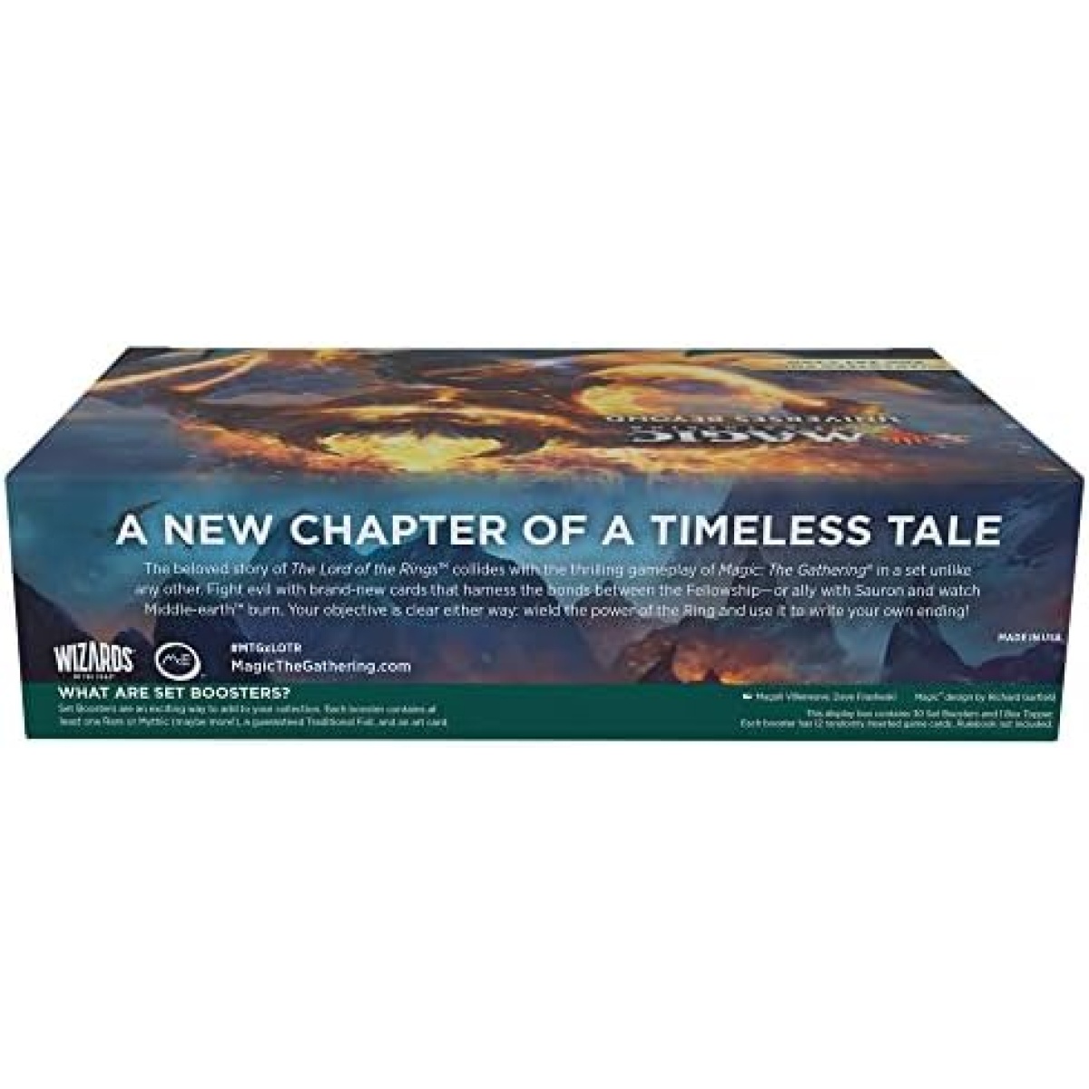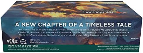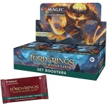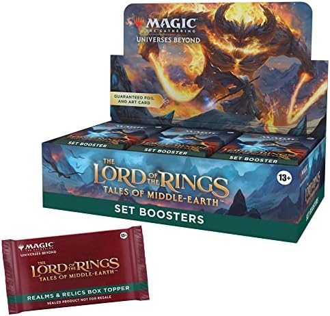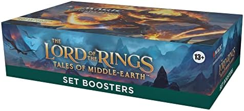 The Lord of the Rings: Tales of Middle-earth Set Booster Box contains 30 The Lord of the Rings: Tales of Middle-earth Set Boosters and 1 Traditional Foil Box Topper card. Each Set Booster contains 12 Magic cards, 1 Art Card, and 1 token/ad card, Helper card, or card from “The List” (a special card from Magic’s history—found in 25% of packs). Every pack includes a combination of 1–4 card(s) of rarity Rare or higher and 3–7 Uncommon, 3–7 Common, and 1 Land cards (Full-Art Middle-earth Map Land in 50% of boosters). A Traditional Foil Land replaces the basic land in 20% of Set Boosters and a Foil-Stamped Signature Art Card replaces the Art Card in 10% of Set Boosters. A Traditional Foil Borderless Mythic Rare card can be found in <1% of boosters. This product does not contain Serialized Ring cards, including the Serialized Elven, Dwarven, or Human Sol Ring cards, and the 1 of 1 Ring (Serialized 001 of 001). Serialized Elven, Dwarven, and Human Sol Ring cards can only be found in some The Lord of the Rings: Tales of Middle-earth Collector Boosters. The Serialized 1 of 1 Ring was originally in an English Collector Booster but was found on June 30, 2023. Non-serialized Ring cards are mechanically identical to their Serialized versions.