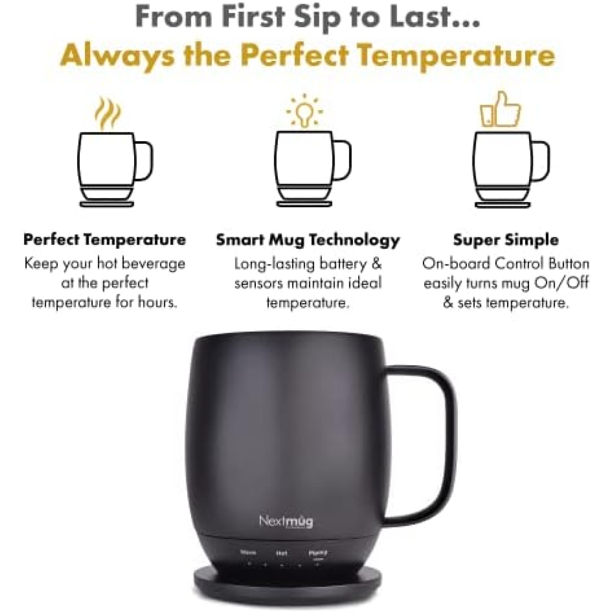 ALWAYS THE PERFECT TEMPERATURE – The Nextmug will keep your hot coffee, tea or preferred beverage at the perfect temperature wherever you are. Simply select Warm (130°), Hot (140°), or Piping (150°) and enjoy for hours.
